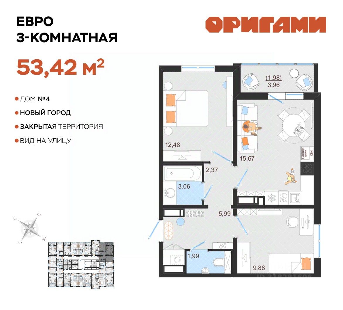 ЖК Оригами Старт продаж дома 4 Комфортная квартира с грамотной планировкой: разумное расположение комнат и просторная кухня гостиная. Сдается в базовой отделке: готова стяжка пола и установлены счетчики, лоджии остеклены и заведен кабель для подключения интернета. Качественные металлические входные двери с надежной фурнитурой. Дополнительно вы можете выбрать любой вид отделки от застройщика — ''whitе bох'' или ''whitе bох PRO'' с полностью готовым санузлом, а также ''под ключ'' в стиле Утро или Вечер. Современные и стильные подъезды с яркими дизайнерскими холлами и качественной отделкой. В каждом подъезде оборудованы просторные колясочные, велосипедные и лапомойки для домашних питомцев. Отдельно вы можете приобрести кладовое помещение на своем этаже для хранения сезонных вещей. Закрытый двор с видеонаблюдением, парковки за пределами двора, грамотное и продуманное зонирование: березовая роща, луг для активностей и пикников площадка для стритбола, столы для тенниса приватные беседки, сухой пляж с шезлонгами, пешеходные дорожки детские площадки с мягким и безопасным покрытием спортивные площадки, воркаут зоны для спорта Пространство с готовой инфраструктурой продуктовый магазин у дома 12 образовательных и творческих школ медицинский кластер 7 торговых центров 5 детских садов парк ''Прибрежный'' Квартира находится на 12 этаже в 1 подъезде