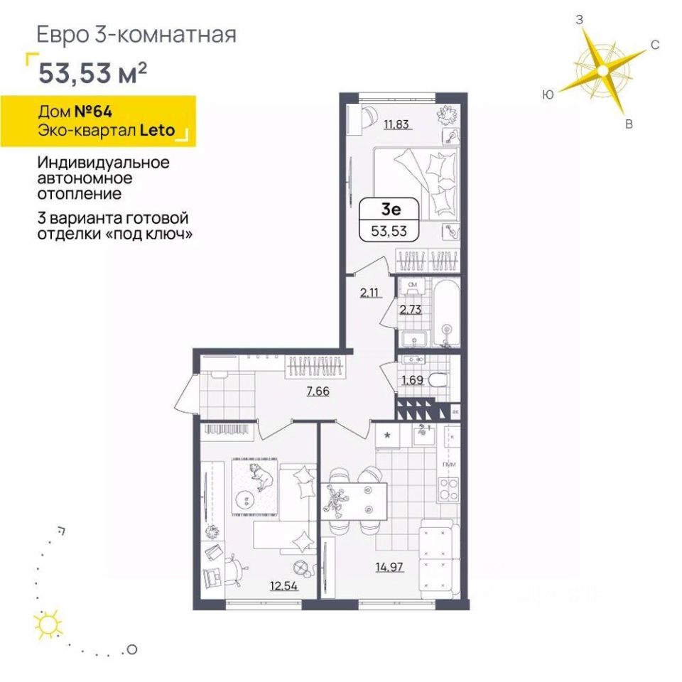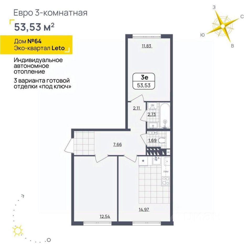 ЖК ЭКОСИТИ Дом 11 Вид на Волгу Просторная квартира с эргономичной планировкой Сдается в базовой отделке: готова стяжка пола и установлены счетчики, лоджии остеклены и заведен кабель для подключения интернета. Качественные металлические входные двери с надежной фурнитурой. Дополнительно вы можете выбрать любой вид отделки от застройщика — ''whitе bох'' или ''whitе bох PRO'' с полностью готовым санузлом, а также ''под ключ'' в стиле Утро или Вечер. Есть возможность приобрести просторную кладовую на своем этаже. Эстетика и современные технологии крышная котельная закрытая территория видео-домофонная связь вход в подъезд по смарт картам безбарьерные входные группы колясочные в каждом подъезде игровые городки для детей, ворк-аут и спортивные зоны для взрослых. Данная квартира находится в 1 подъезде на 7 этаже