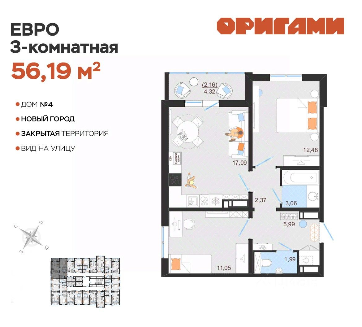 ЖК Оригами Старт продаж дома 4 Комфортная квартира с грамотной планировкой: разумное расположение комнат и просторная кухня гостиная. Сдается в базовой отделке: готова стяжка пола и установлены счетчики, лоджии остеклены и заведен кабель для подключения интернета. Качественные металлические входные двери с надежной фурнитурой. Дополнительно вы можете выбрать любой вид отделки от застройщика — ''whitе bох'' или ''whitе bох PRO'' с полностью готовым санузлом, а также ''под ключ'' в стиле Утро или Вечер. Современные и стильные подъезды с яркими дизайнерскими холлами и качественной отделкой. В каждом подъезде оборудованы просторные колясочные, велосипедные и лапомойки для домашних питомцев. Отдельно вы можете приобрести кладовое помещение на своем этаже для хранения сезонных вещей. Закрытый двор с видеонаблюдением, парковки за пределами двора, грамотное и продуманное зонирование: березовая роща, луг для активностей и пикников площадка для стритбола, столы для тенниса приватные беседки, сухой пляж с шезлонгами, пешеходные дорожки детские площадки с мягким и безопасным покрытием спортивные площадки, воркаут зоны для спорта Пространство с готовой инфраструктурой продуктовый магазин у дома 12 образовательных и творческих школ медицинский кластер 7 торговых центров 5 детских садов парк ''Прибрежный'' Квартира находится на 13 этаже в 1 подъезде
