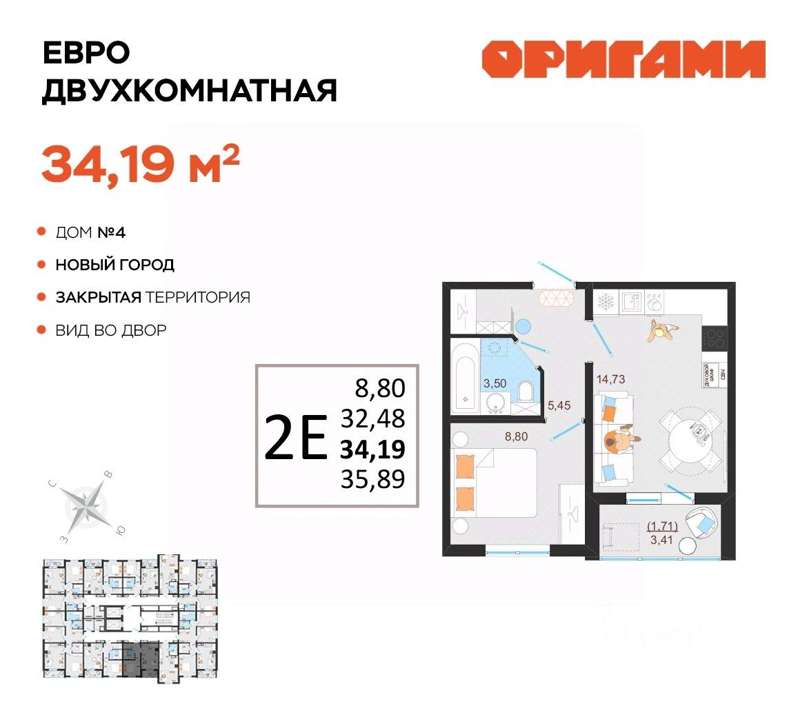 ЖК Оригами Старт продаж дома 4 Комфортная квартира с грамотной планировкой: разумное расположение комнат и просторная кухня гостиная. Сдается в базовой отделке: готова стяжка пола и установлены счетчики, лоджии остеклены и заведен кабель для подключения интернета. Качественные металлические входные двери с надежной фурнитурой. Дополнительно вы можете выбрать любой вид отделки от застройщика — ''whitе bох'' или ''whitе bох PRO'' с полностью готовым санузлом, а также ''под ключ'' в стиле Утро или Вечер. Современные и стильные подъезды с яркими дизайнерскими холлами и качественной отделкой. В каждом подъезде оборудованы просторные колясочные, велосипедные и лапомойки для домашних питомцев. Отдельно вы можете приобрести кладовое помещение на своем этаже для хранения сезонных вещей. Закрытый двор с видеонаблюдением, парковки за пределами двора, грамотное и продуманное зонирование: березовая роща, луг для активностей и пикников площадка для стритбола, столы для тенниса приватные беседки, сухой пляж с шезлонгами, пешеходные дорожки детские площадки с мягким и безопасным покрытием спортивные площадки, воркаут зоны для спорта Пространство с готовой инфраструктурой продуктовый магазин у дома 12 образовательных и творческих школ медицинский кластер 7 торговых центров 5 детских садов парк ''Прибрежный'' Квартира находится на 4 этаже в 1 подъезде