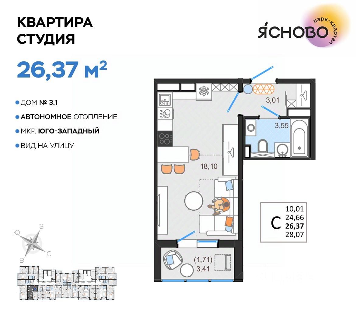 ЖК Ясново Дом 4 Старт продаж! Комфортная квартира во второй очереди парк-квартала Ясново. Квартира сдается в базовой отделке: готова стяжка пола и установлены счетчики, лоджии остеклены и заведен кабель для подключения интернета. Качественные металлические входные двери с надежной фурнитурой. Дополнительно вы можете выбрать любой вид отделки от застройщика — ''whitе bох'' или ''whitе bох PRO'' с полностью готовым санузлом, а также ''под ключ'' в стиле Утро или Вечер. О жилом комплексе: — Зелёные аллеи и закрытые дворы без машин — Спортивные и детские площадки — Велодорожки, зоны для отдыха и прогулок — Современные входные группы и дизайнерские МОПы Отличная локация: — 5 минут до гипермаркета ''Лента'' — Рядом строится новый физкультурно-оздоровительный комплекс — До центра города — 1520 минут — Удобный выезд в любую часть города Квартира на 3 этаже