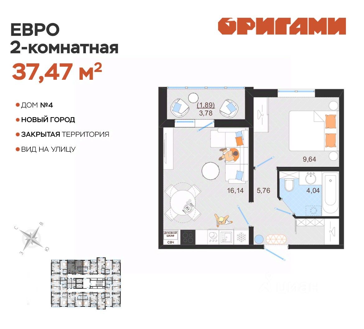 ЖК Оригами Старт продаж дома 4 Комфортная квартира с грамотной планировкой: разумное расположение комнат и просторная кухня гостиная. Сдается в базовой отделке: готова стяжка пола и установлены счетчики, лоджии остеклены и заведен кабель для подключения интернета. Качественные металлические входные двери с надежной фурнитурой. Дополнительно вы можете выбрать любой вид отделки от застройщика — ''whitе bох'' или ''whitе bох PRO'' с полностью готовым санузлом, а также ''под ключ'' в стиле Утро или Вечер. Современные и стильные подъезды с яркими дизайнерскими холлами и качественной отделкой. В каждом подъезде оборудованы просторные колясочные, велосипедные и лапомойки для домашних питомцев. Отдельно вы можете приобрести кладовое помещение на своем этаже для хранения сезонных вещей. Закрытый двор с видеонаблюдением, парковки за пределами двора, грамотное и продуманное зонирование: березовая роща, луг для активностей и пикников площадка для стритбола, столы для тенниса приватные беседки, сухой пляж с шезлонгами, пешеходные дорожки детские площадки с мягким и безопасным покрытием спортивные площадки, воркаут зоны для спорта Пространство с готовой инфраструктурой продуктовый магазин у дома 12 образовательных и творческих школ медицинский кластер 7 торговых центров 5 детских садов парк ''Прибрежный'' Квартира находится на 14 этаже в 1 подъезде