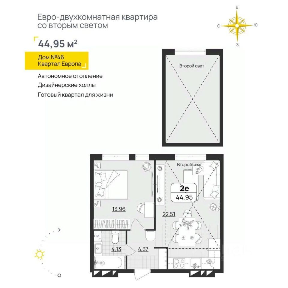 ЖК ПРЕМЬЕРА НА УКСМ Дом 4 Квартира с функциональной и продуманной планировкой: большая кухня и только полезные метры. Сдается в базовой отделке: выполнена стяжка пола, лоджии остеклены, установлены счетчики, заведен кабель для подключения интернета. Установлены качественные металлические входные двери с надежной фурнитурой. Дополнительно вы можете выбрать любой вид отделки от застройщика — ''whitе bох'' или ''whitе bох PRO'' с полностью готовым санузлом, а также ''под ключ'' в стиле Утро или Вечер. В каждом подъезде — колясочные для хранения малогабаритного транспорта, видео-домофонная связь, вход в подъезд по смарт картам. Холлы с прозрачными входными группами и современным интерьером. Есть возможность приобрести кладовую на своем этаже площадью 10,44 м2. Дом с крышной котельной. Больше не нужно переживать о начале отопительного сезона и перебоях с горячей водой и переплачивать за ''коммуналку''. Уютные дворы оборудованы игровыми и спортивными площадками для детей разного возраста и взрослых. Благодаря небольшому количеству домов у вас не возникнет проблем с парковкой. Все социально значимые объекты — рядом с домом •гипермаркет Магнит •школа со сквером через дорогу •Александровский парк •новый детский сад (сдан в 2023г.) •проектируется новая поликлиника •аквапарк Улет Квартира находится на 2 этаже в 1 подъезде