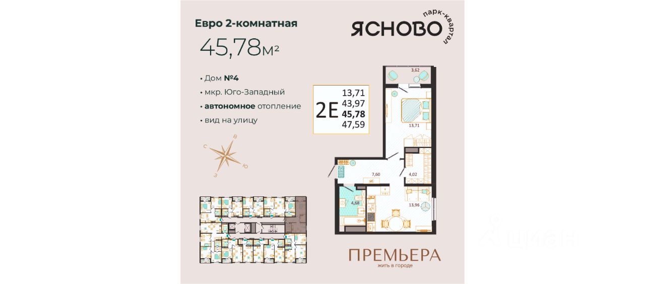 О жилом комплексе: — Зелёные аллеи и закрытые дворы без машин — Спортивные и детские площадки — Велодорожки, зоны для отдыха и прогулок — Современные входные группы и дизайнерские МОПы