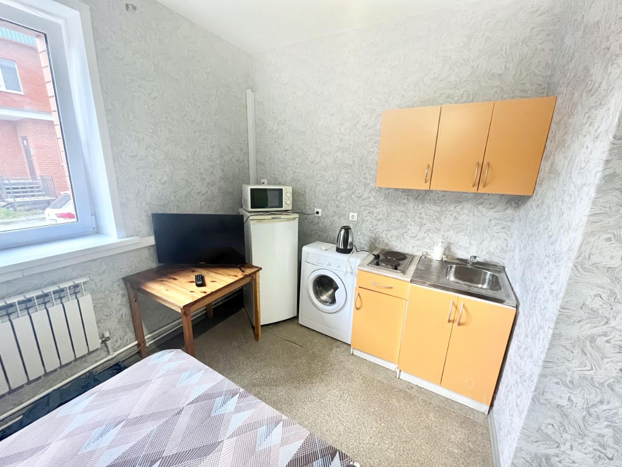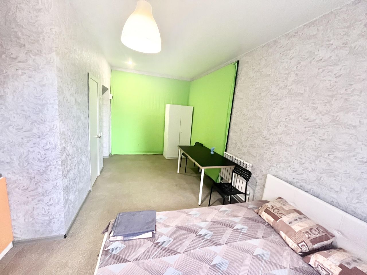 В ней есть: двуспальная кровать (односпальную дополнительно можем поставить), холодильник, телевизор, стиральная машина автомат, WI-FI, кухонный гарнитур, шкаф, посуда, постельное белье.