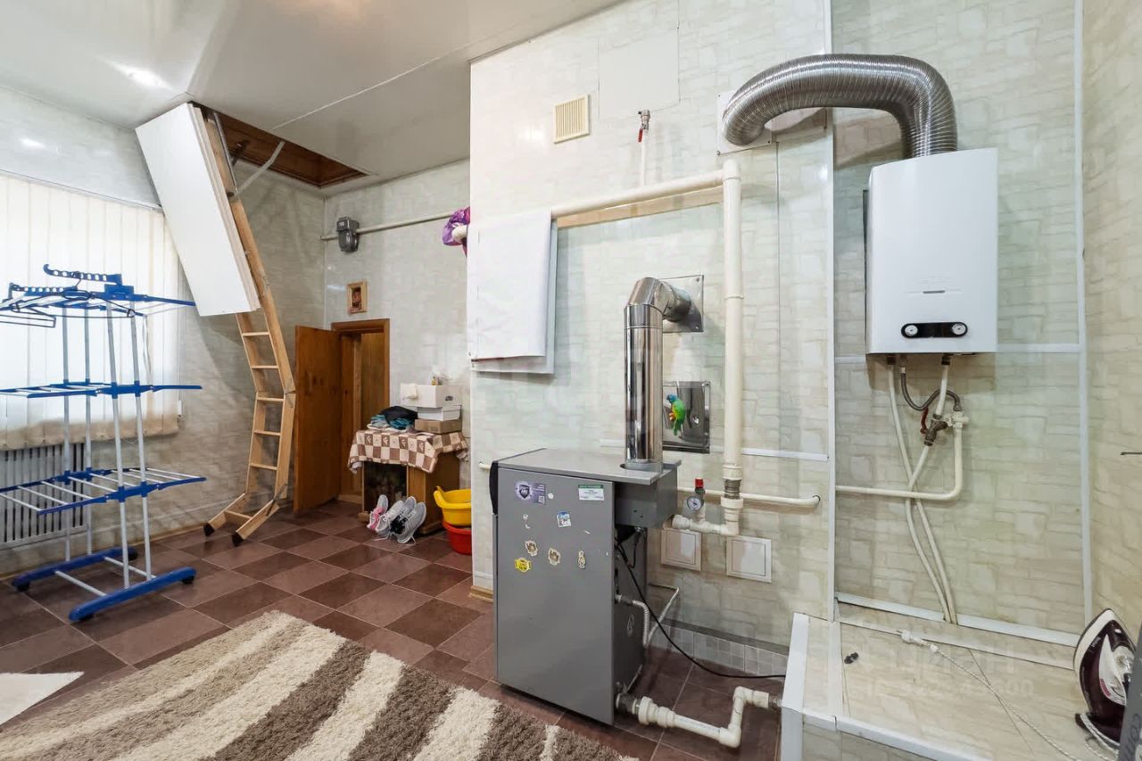 Благоустроенная территория дополнена гаражом на два автомобиля, погребом для хранения запасов, а также зоной для отдыха с мангалом и беседкой. Инженерные коммуникации обеспечивают бесперебойное проживание: дом подключен к центральным водоснабжению и канализации, а отопление осуществляется с помощью надежного газового котла.