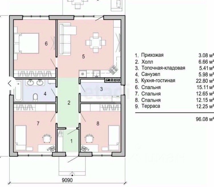 Двухэтажный дом общей площадью 101 кв.м, количество спальных комнат 3, просторная гостиная, кухня с кладовой, санузел, бойлерная.
