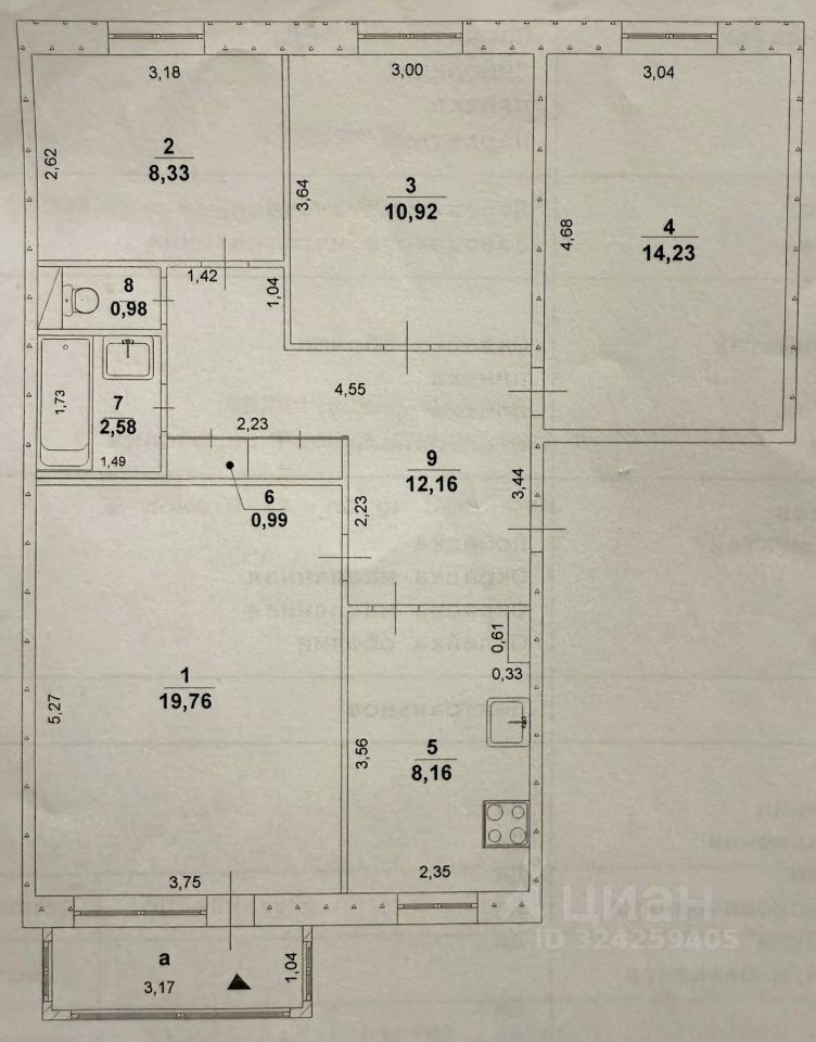 комнаты: 19, 76 / 10, 92 / 14, 23 / 8, 33 кв. м. кухня — 8, 16 кв. м. (есть возможность увеличить за счёт зала).