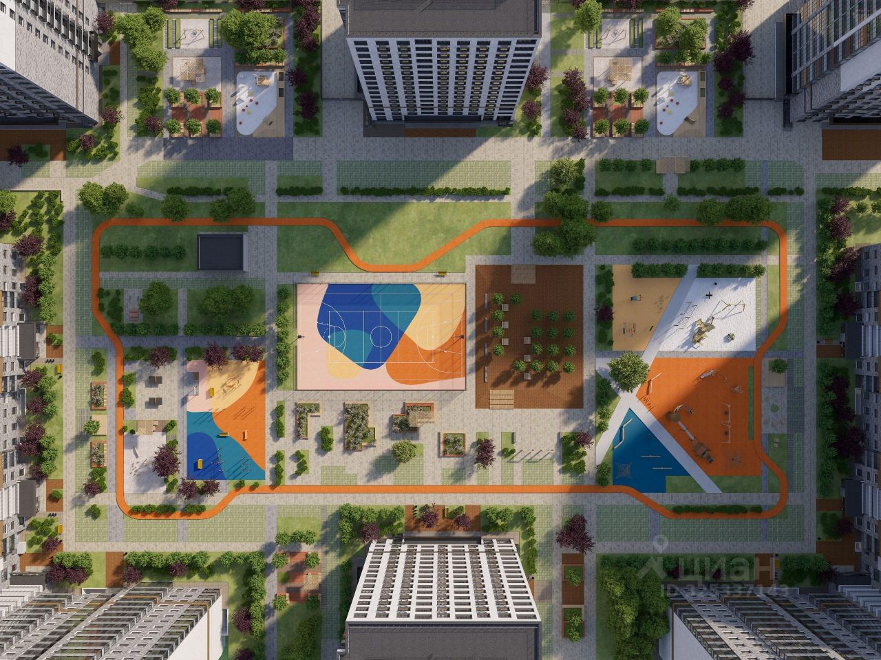 Основная достопримечательность ЖК Атмосфера - огромный зеленый двор-парк площадью более 3,5 га, где для создания камерности и уюта будет создана система возвышенностей из разных материалов и разного функционального назначения, таких как: геопластика на детской площадке, приподнятое озеленение и холмы, пространство без машин - парковки выведены за пределы двора.