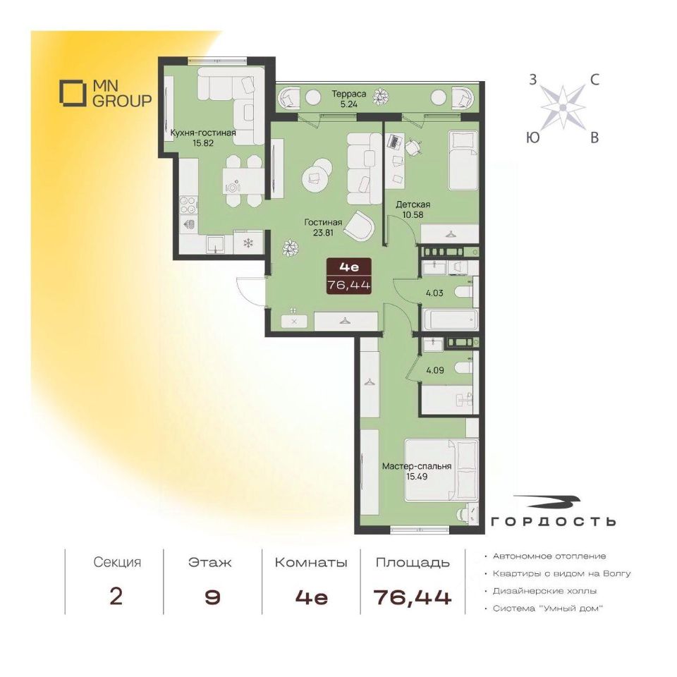 Преимущества: Панорамные виды на Волгу Автономное отопление Двор без машин Усиленная шумоизоляция пола Горизонтальная разводка Разнообразие планировочных решений Закрытая территория с видеонаблюдением 24/7 Система Умный дом