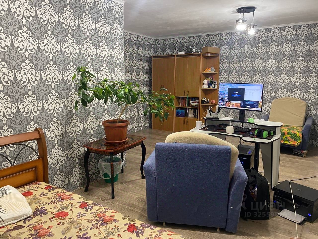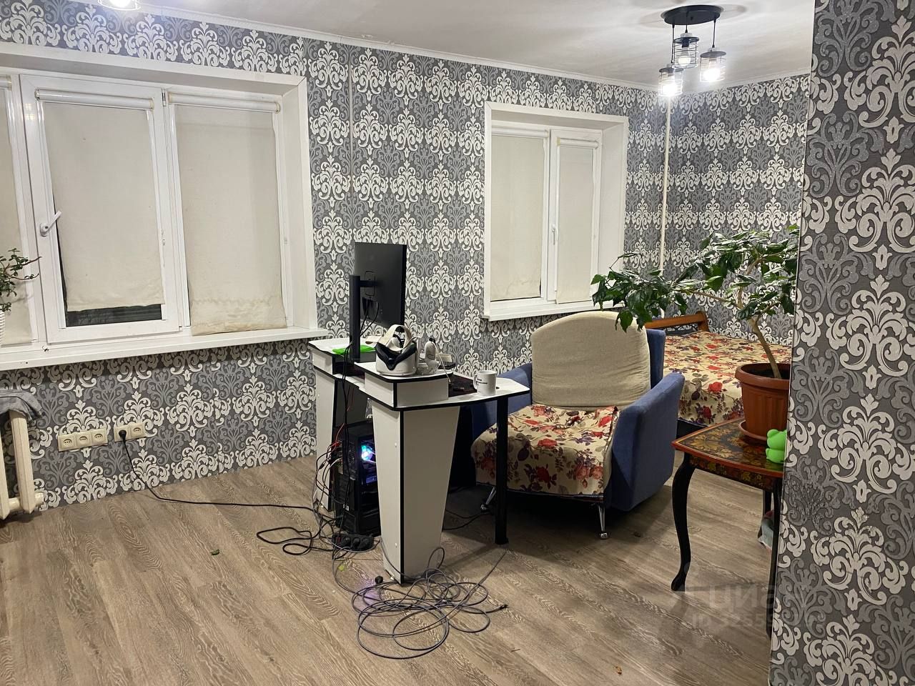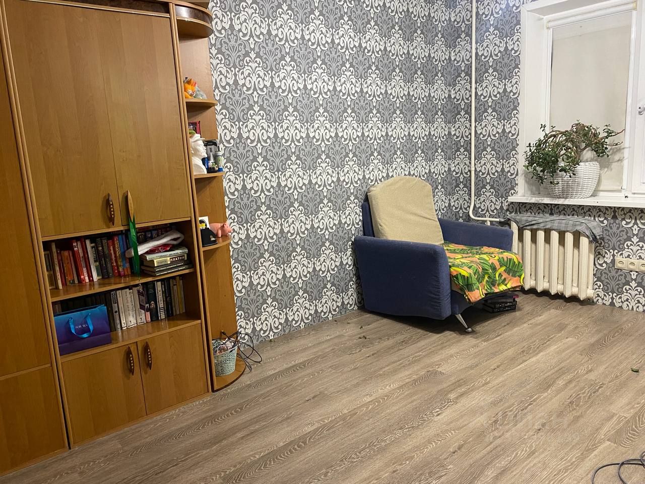 Стены оклеены обоями. Натяжной потолок в зале. Решетки на окнах лоджий.