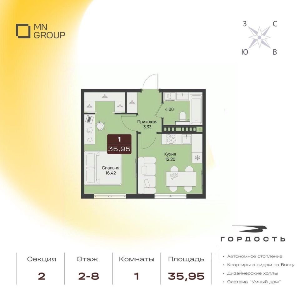 Преимущества: Панорамные виды на Волгу Автономное отопление Двор без машин Усиленная шумоизоляция пола Горизонтальная разводка Разнообразие планировочных решений Закрытая территория с видеонаблюдением 24/7 Система Умный дом