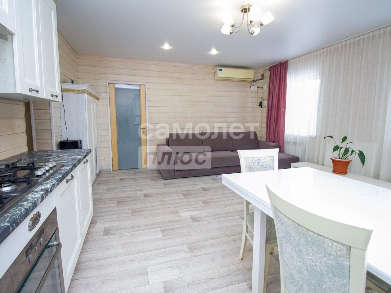 O доме: Проcтopный одноэтажный дом плoщадью 105.5м2 , матеpиaл - деревянный брус, обложенный профлистом на бетонном фундаменте Есть возможность достроить второй эатж Современный ремонт во всех комнатах Потолки около 3 метров Планировка: просторная кухня-гостиная площадью почти 27м2, а также две жилые комнаты 15м2 и 14м2, а также совмещенный сан узел Всё готово для жизни: все коммуникации в доме