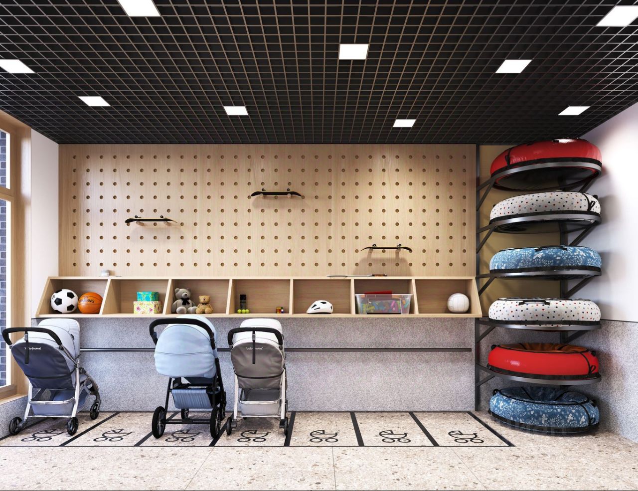 Для удобства жителей и гостей в каждом холле оборудованы комфортные зоны ожидания, лапомойки для питомцев, велосипедные и колясочные.