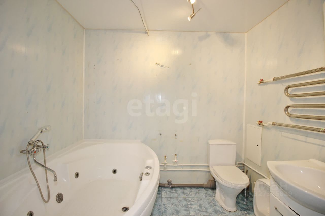 Санузел 5,8 кв.м.,обшит пластиковыми панелями, на полу уложен хороший кафель. Есть большая джакузи, водонагреватель. Можно сделать раздельный - площадь позволяет.